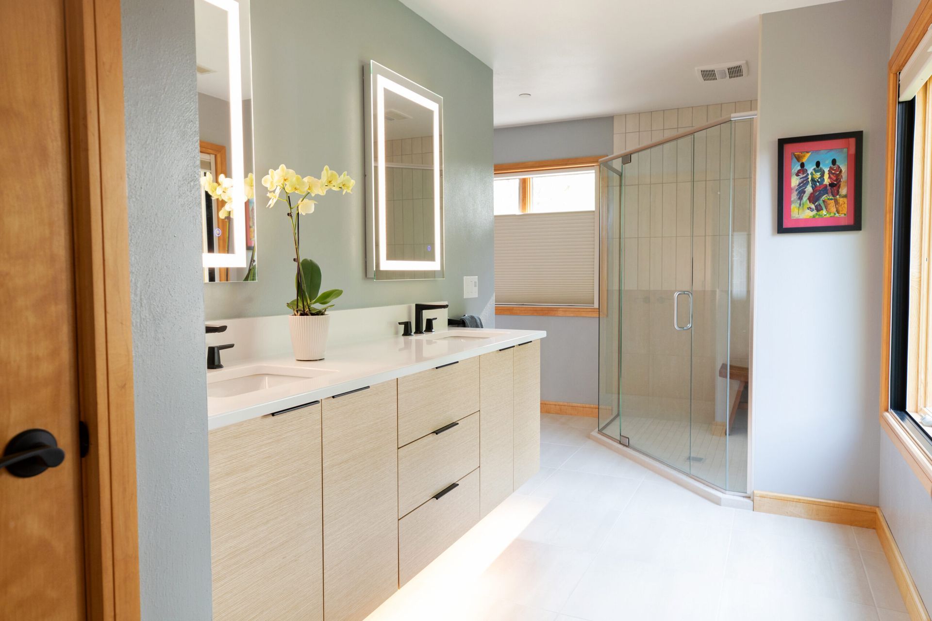 Dondi hid visual clutter in the new shower by cleverly hiding the controls and a storage niche behind a wall, which can only be seen from inside the shower itself. Anyone looking in the doorway wouldn’t even know these things existed.Beyond the L-shape itself, this bathroom is all about lines. You can see it in everything from the cabinetry finish, to the tile design in the shower, to the mirrors above the vanity. Everything feels streamlined and modern due to the way these lines interact with each other.